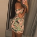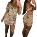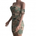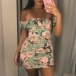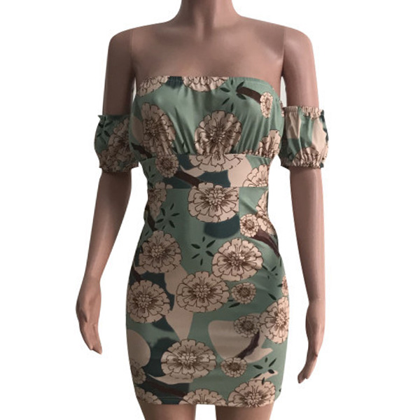 floral print with body-con silhouette, elastic off-the-shoulder neckline, high rise banded waist, short sleeve,