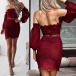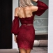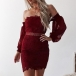 a form-fitting silhouette, an off-the-shoulder neckline, a long sleeve, a hollow out accent at the waist,