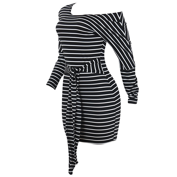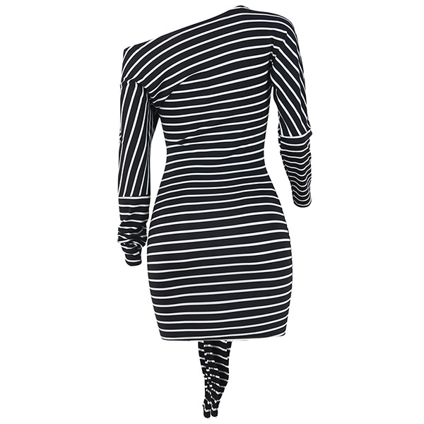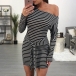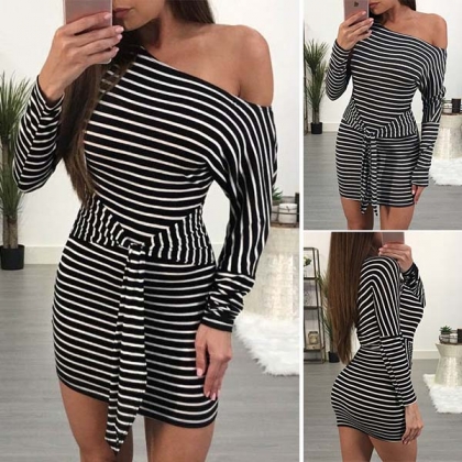 The dress feature a form-fitting silhouette with an allover striped design, off-the-shoulder neckline,