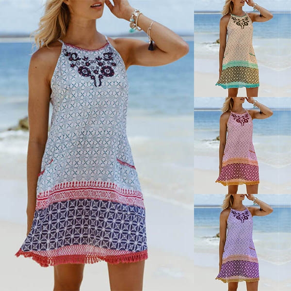 Sling style,the chic printed details and tassel hem design make this piece look so eye-catching