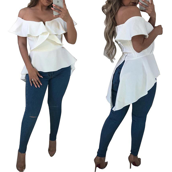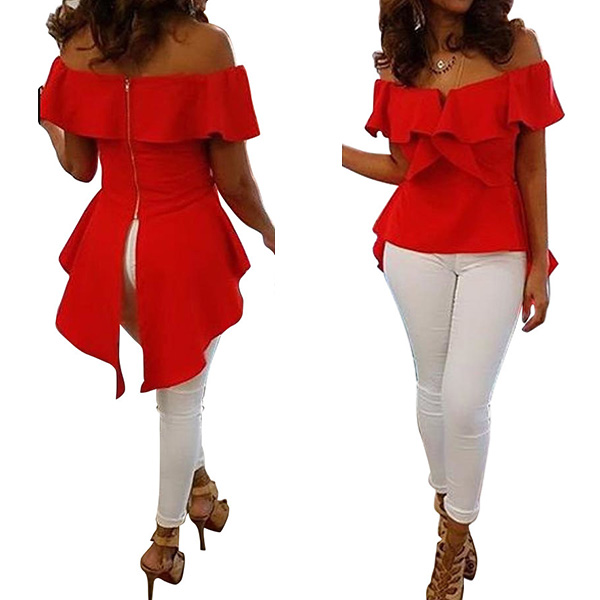 finished with ruffle boat neck and slit high-low hem,sexy and alluring. Matching with your high waist