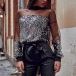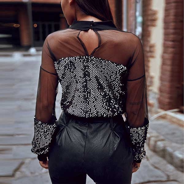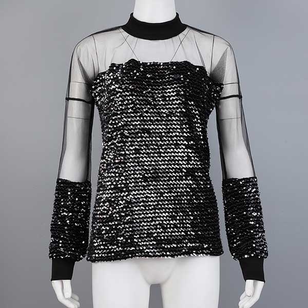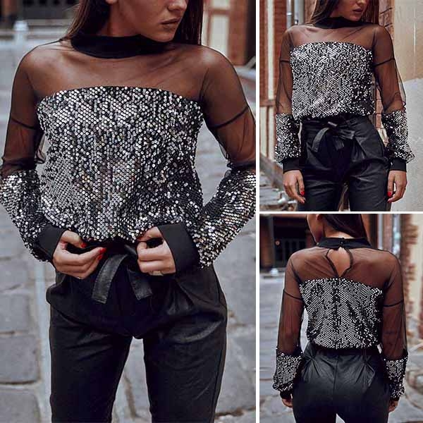 Sexy See-through Gauze Spliced Long Sleeve Sequin Top