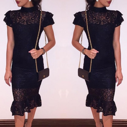 Sexy Short Sleeve Mock Neck Slim Fit Lace Dress