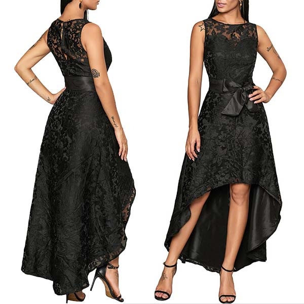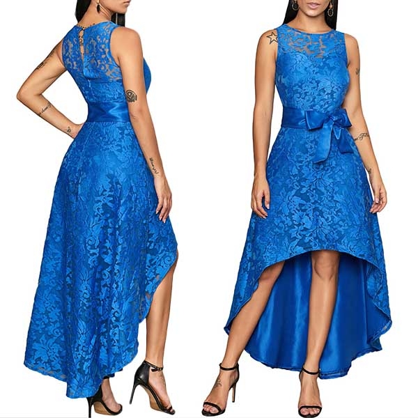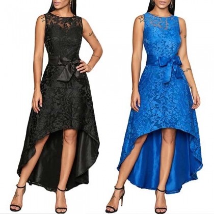 It is finished with sleeveless,round neck,high waist and a high-low hem,elegant,delicate yet charming!