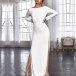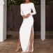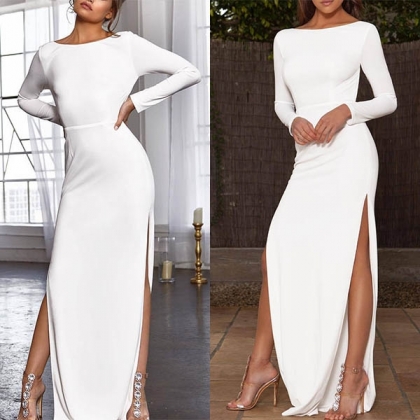 This white dress is finished with long sleeve,round neck and a fit silhouette,the slit hem design will enhance