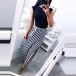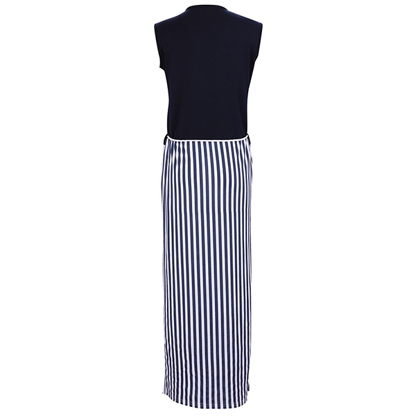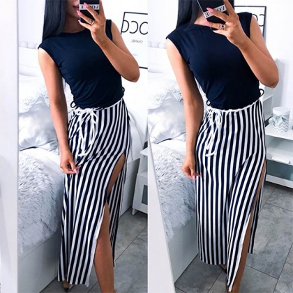 round neck and maxi length design,the slit hem and striped spliced design will make this piece look more