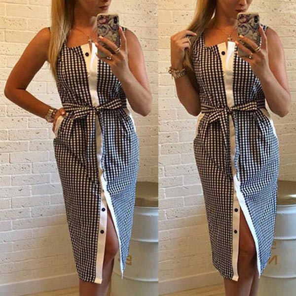 Boost your beautiful charms with the help of this sleeveless dress! Its slit hem and square collar