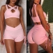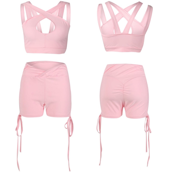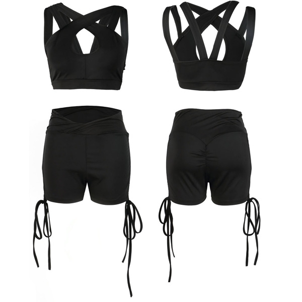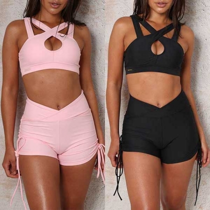 the cami strap crossover through the back, as well as a high-rise waist short, outfit with drawstring design
