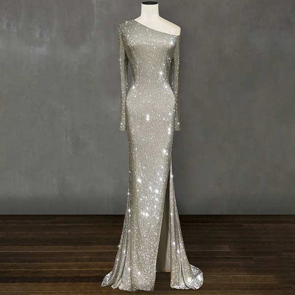 Expertly draft from soft and shimmering knit fabric, feature a long-line silhouette with one shoulder