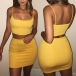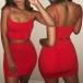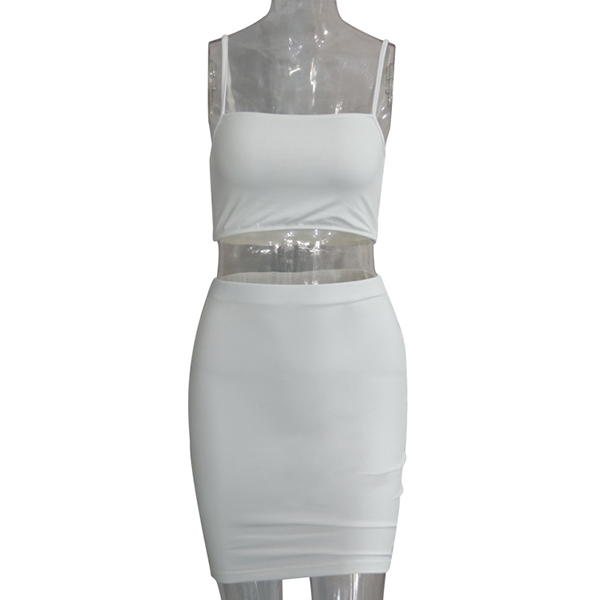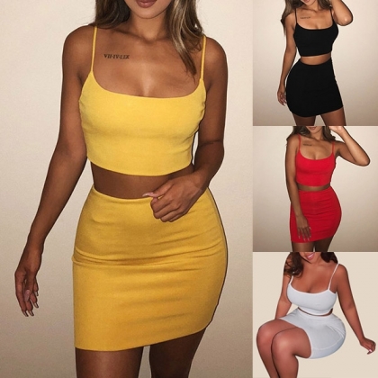 two-piece set. Comes with a solid color,including a sling crop top and a high waist skirt,this two-piece set