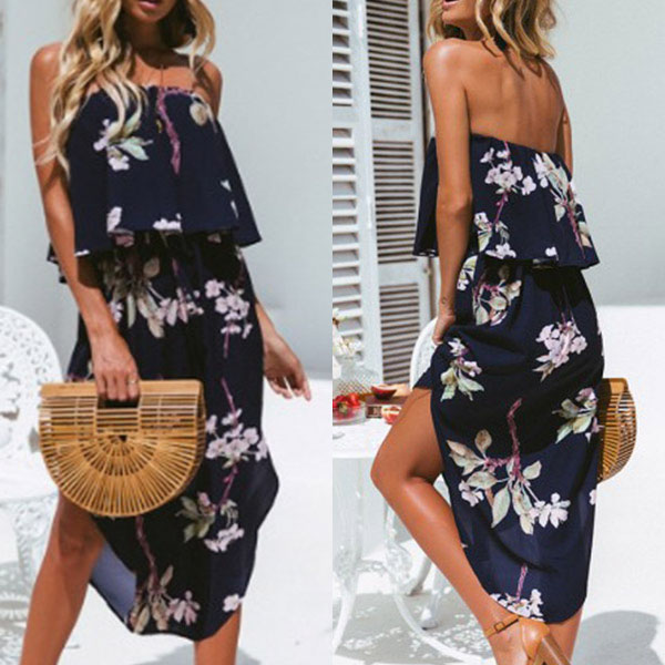 Boasts vibrant floral print,the strapless and irregular hem design will further enhance its charm.
