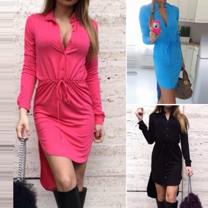 This piece of shirt dress is solid color. This piece of dress is not only styled with a drawstring waistline,