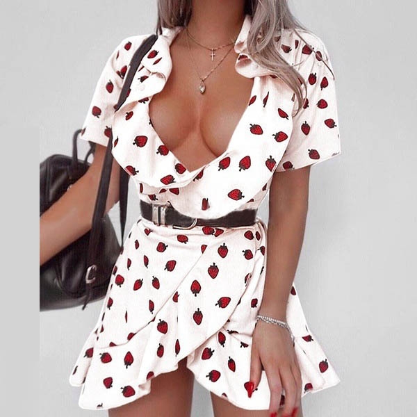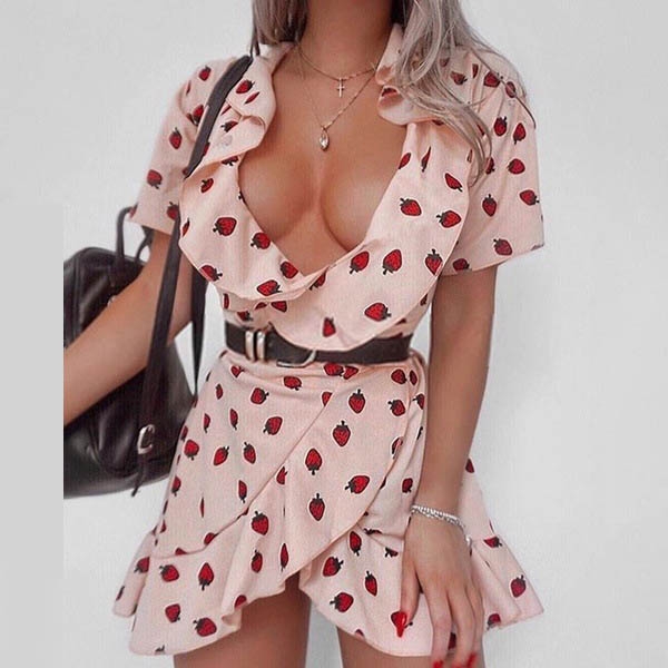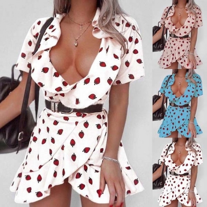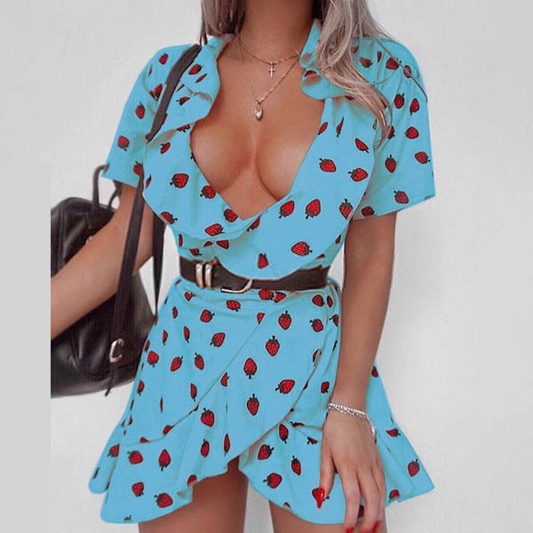 eye-catching printed details,the v-neck and irregular ruffle hem design make this dress look so
