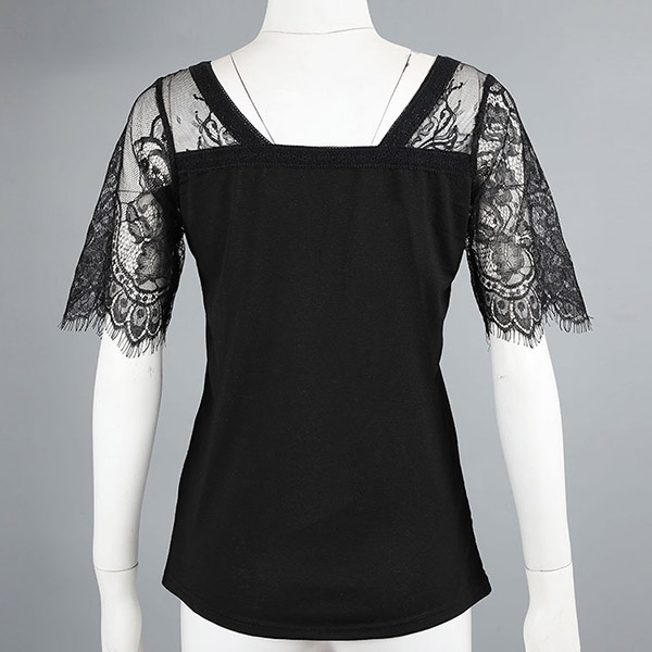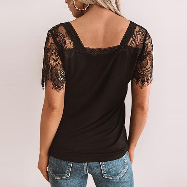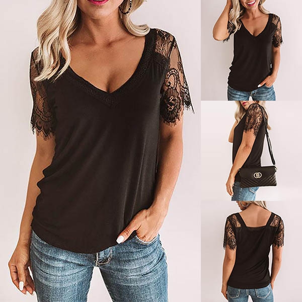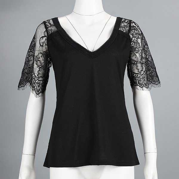 This t-shirt comes with a classic yet stylish black tone,the v-neck and lace spliced design can lend
