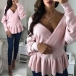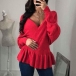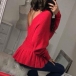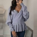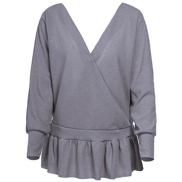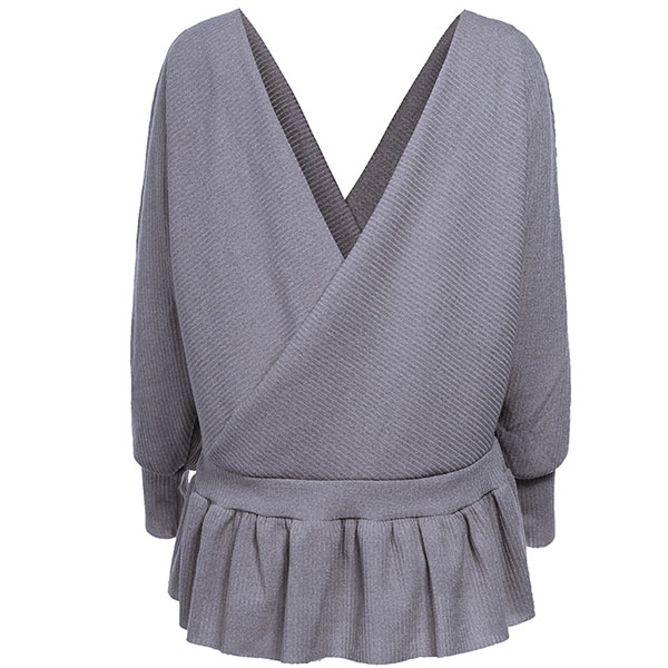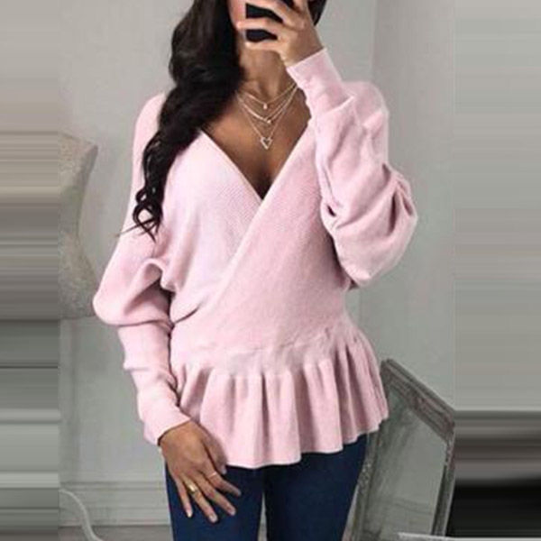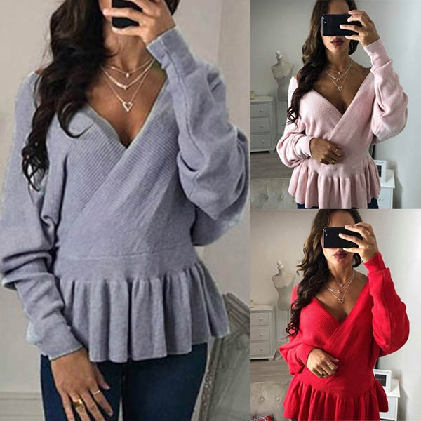 In this early autumn,this knit top would strike your mind. It boasts a solid color,the v-neck and ruffle hem
