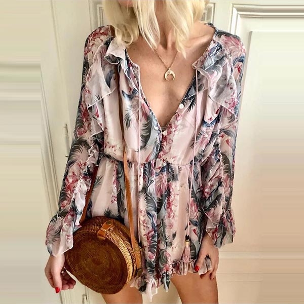 you this piece. This romper boasts eye-catching printed details,the v-neck and ruffle design will further