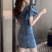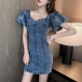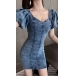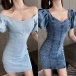slip into this breathtaking denim dress. Its puff sleeve and v-neck design can exude your feminine
