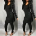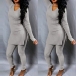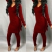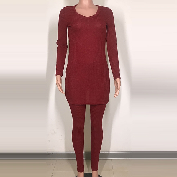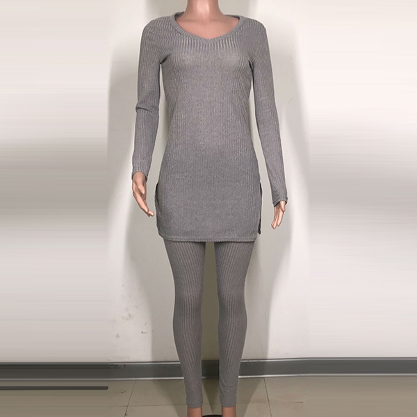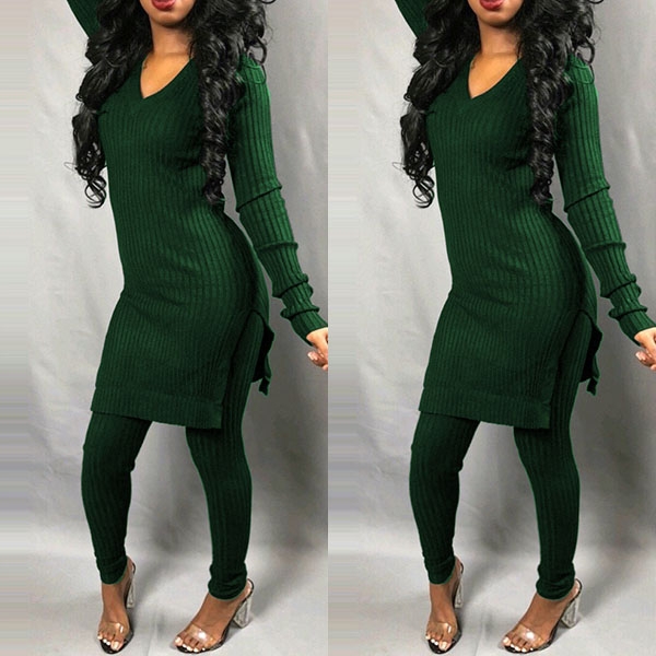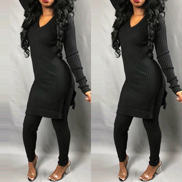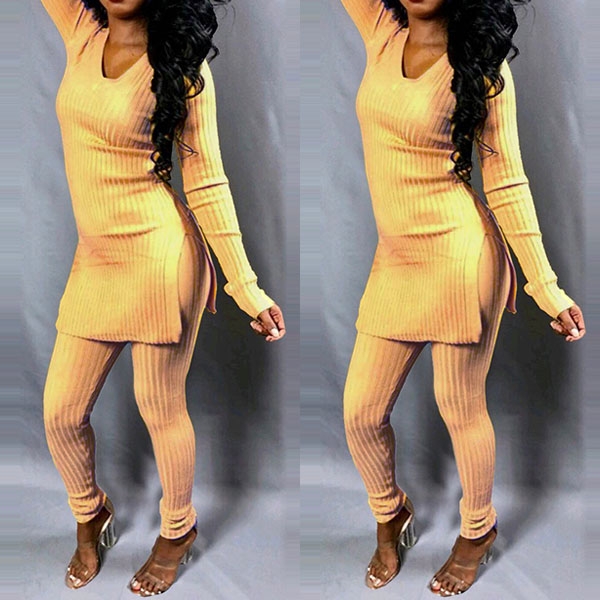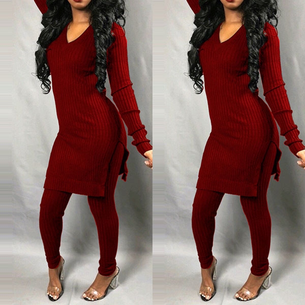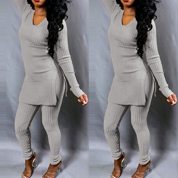 with a solid color,including a long sleeve,v-neck slit hem top and a high waist pants,this two-piece set can
