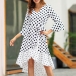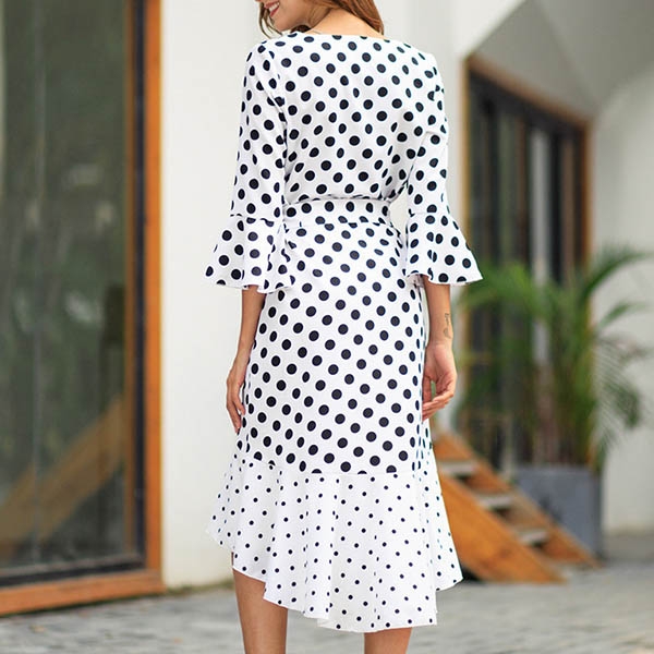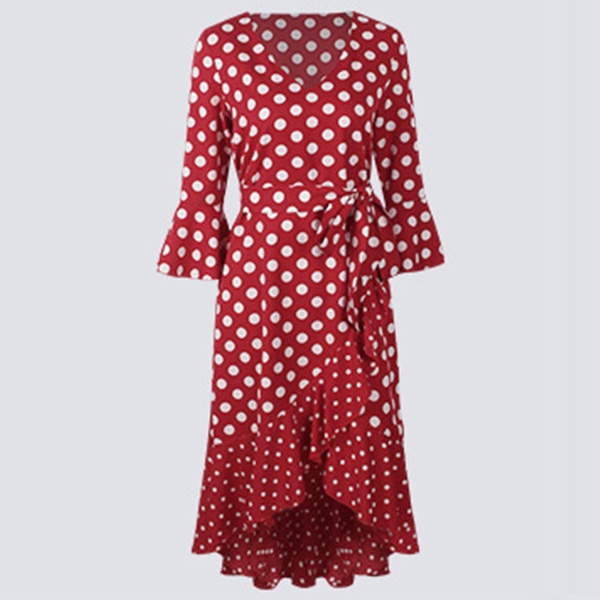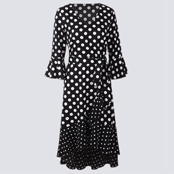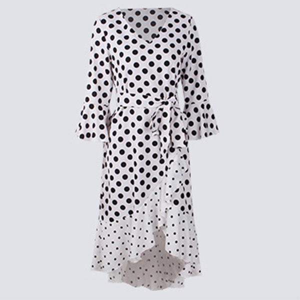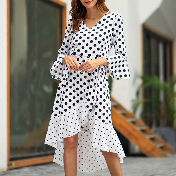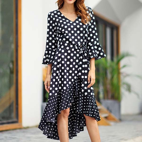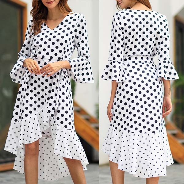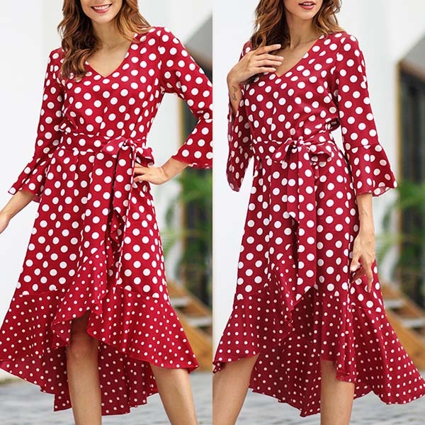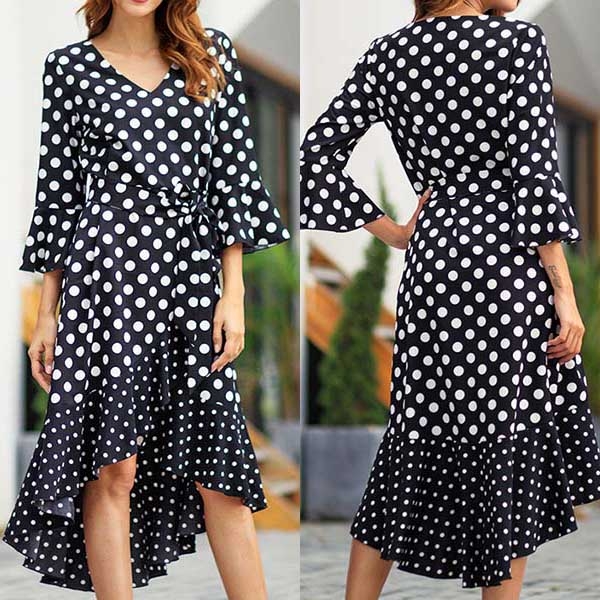 Looking for a proper dress for your night dating or weekend out with your friends will no longer be a problem if you have this dress in your team. The dots printed design will make this piece look more playful and eye-catching,while the v-neck,trumpet sleeve and high-low hem design will further enhance its charm. Add one to your wardrobe.