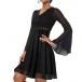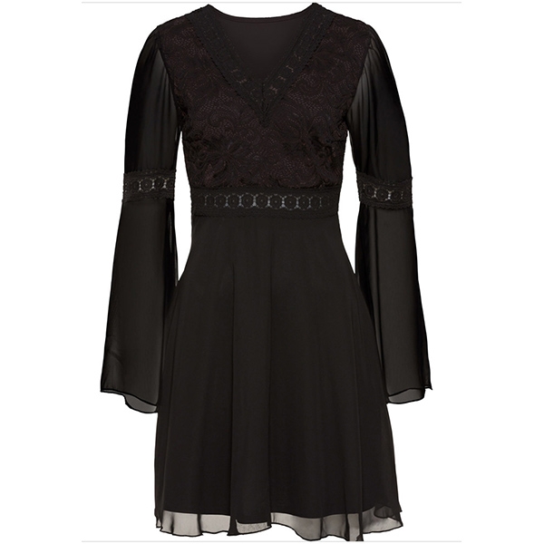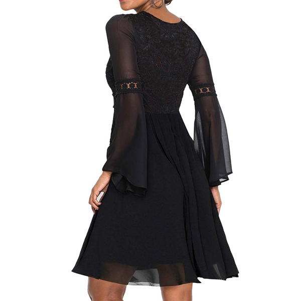 black tone,the v-neck,trumpet sleeve and lace spliced design make this dress look sexy and alluring.