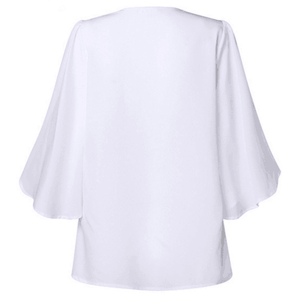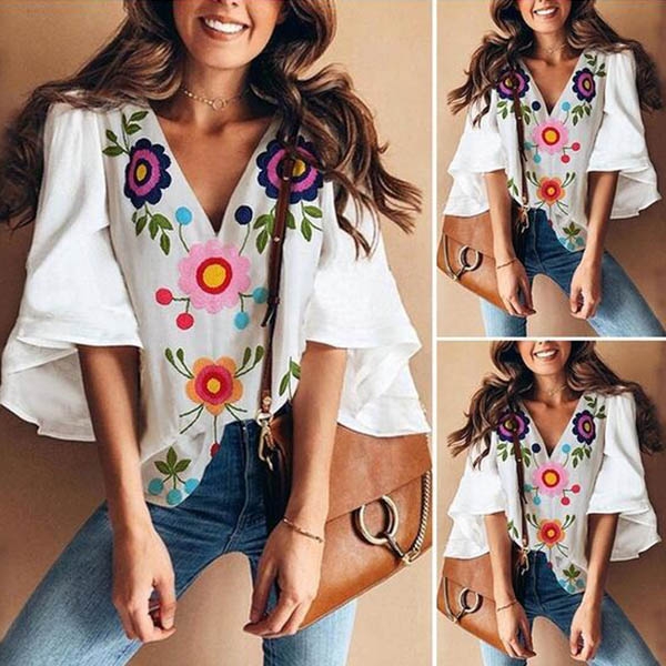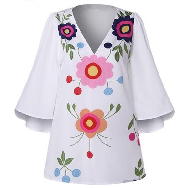 eye-catching printed details,the trumpet sleeve and v-neck design will further enhance its charm.