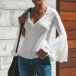 Update your wardrobe by adding this t-shirt. It boasts a solid color,the v-neck and trumpet sleeve design