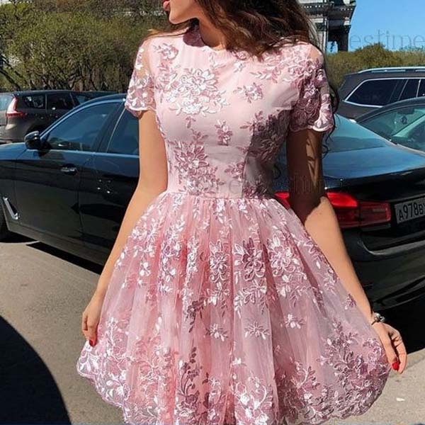 Boasts a sweet pink tone,with short sleeve and round neck design,this piece can easily express