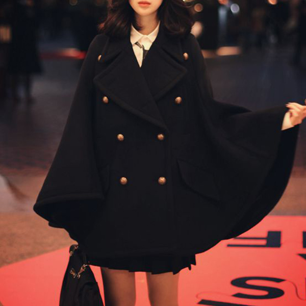 Ta den här kappan för att visa din chica och unika stil. Den har enfärgad stil, dubbelknäppt design, unik cape-stil och fladdermus ärmdesign. Du kan kombinera den med jeans.