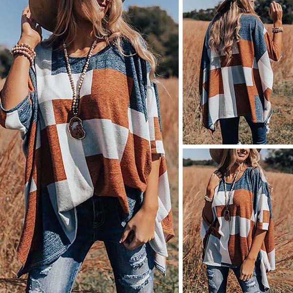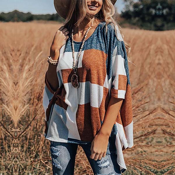 Showcase your chic and stylish personality through this top. Contrast color design makes it look more stylish. Finished with 3/4 sleeve,round neck,an irregular hem and a loose silhouette,this piece is sure to offer you a comfortable day. A good choice for your casual days.