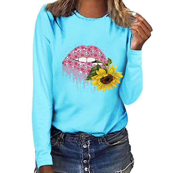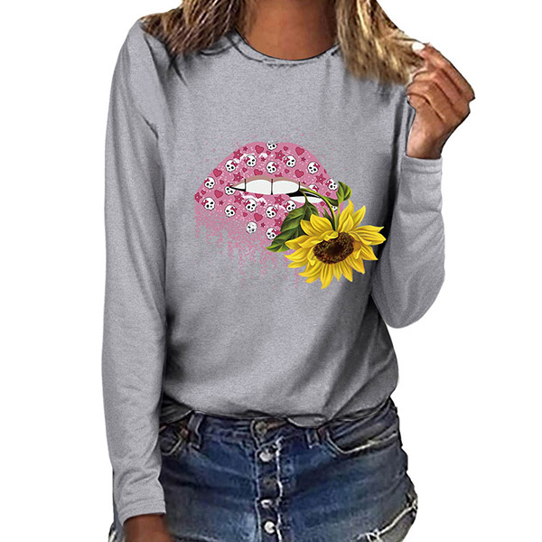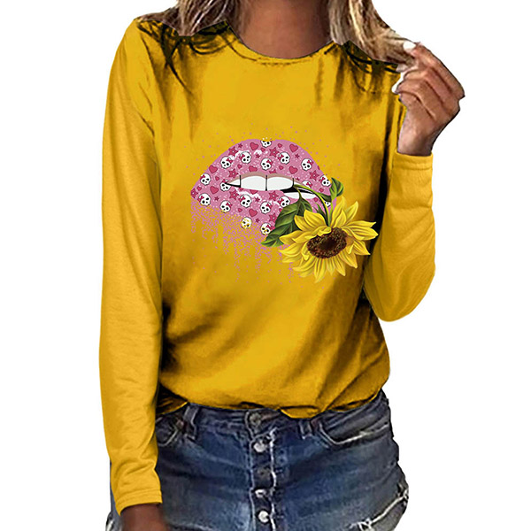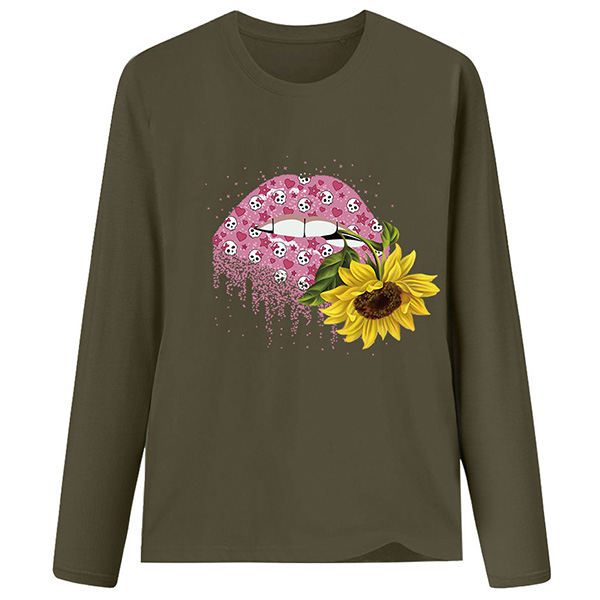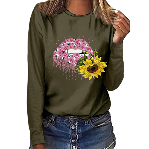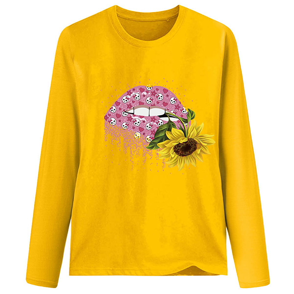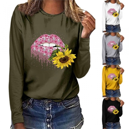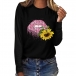 Chic Style Lip Sunflower Printed Long Sleeve Round Neck T-shirt