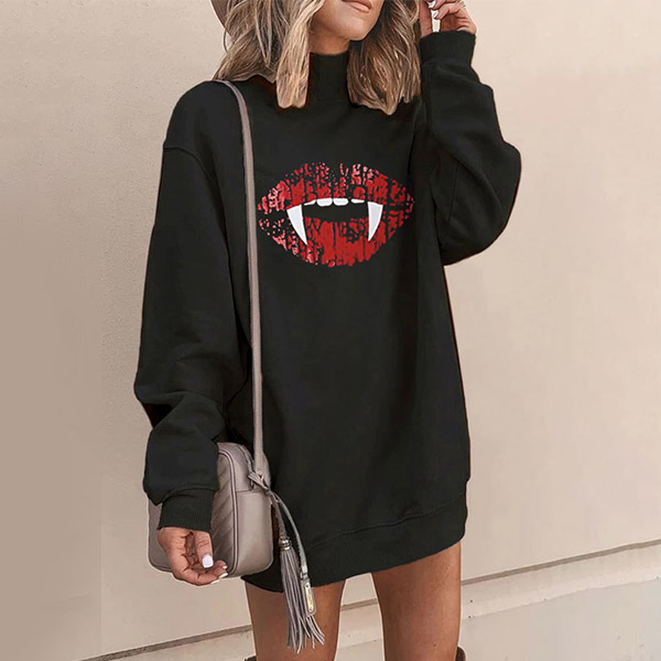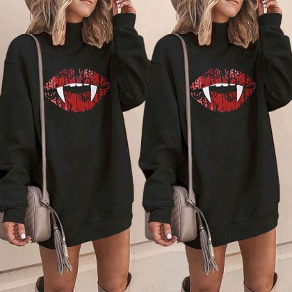 Chic Style Red-lip Printed Long Sleeve Mock Neck Sweatshirt Dress