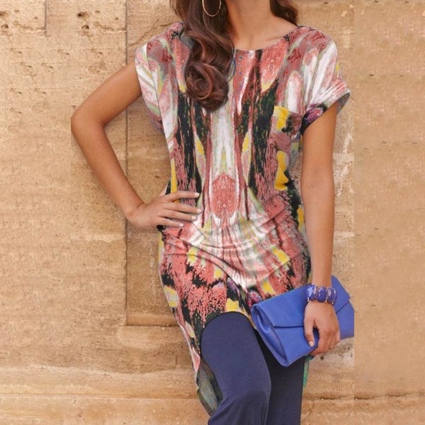 Chic Style Short Sleeve Round Neck Irregular Hem Printed T-shirt