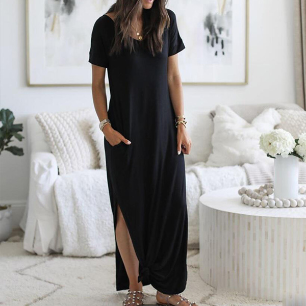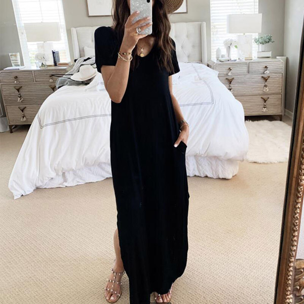 This dress boasts a solid color,its soft and breathable fabric can ensure you a comfortable day,while the slit hem design will further enhance its charm. You can simply match with your casual flat shoes to enjoy your casual weekends.