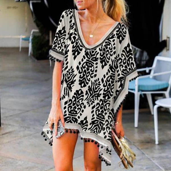 For these sunny days,this smock would be your good choice. Its chic printed details and tassel design make this piece full of personality,while its soft fabric and loose silhouette design can ensure you a comfortable day. Perfect matching with your bikini set when you head to the seaside.