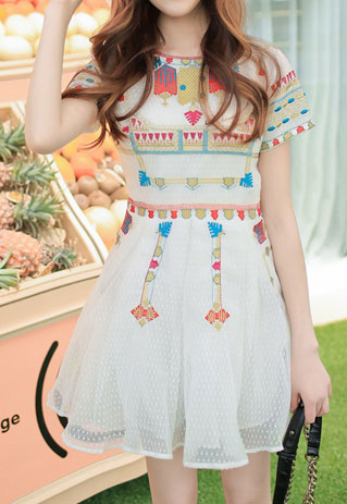 The short-sleeve dress features comfortable silk blend,a round neck,all-over embroidered abstract patterns in mixed colors,a slim fit,with an attached crinoline.Pair this sweet style with platform sandals.