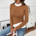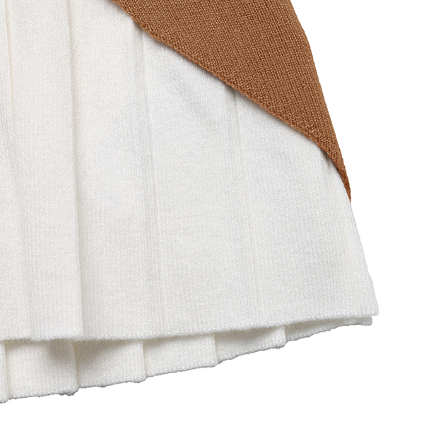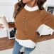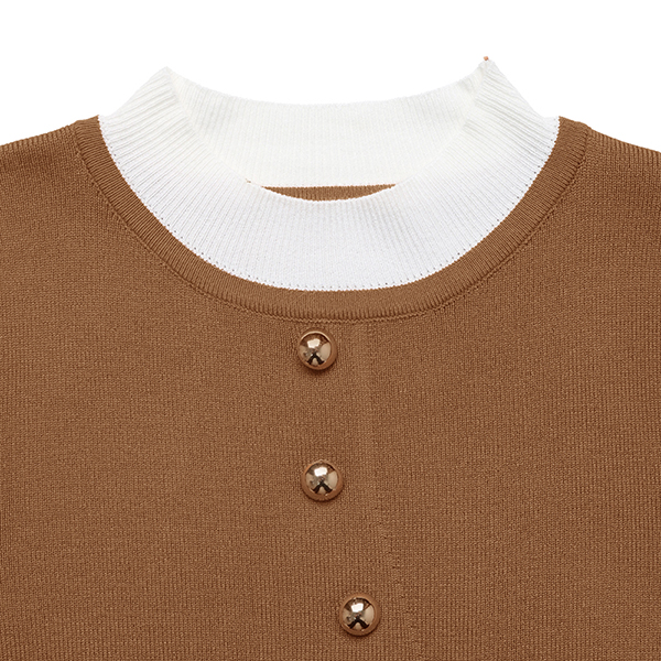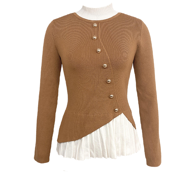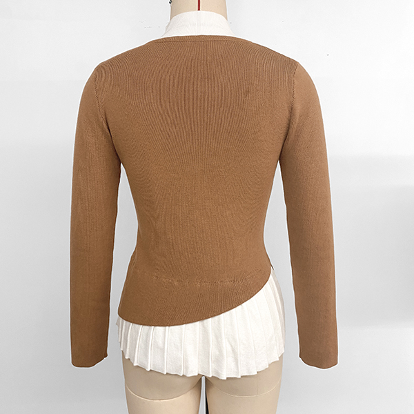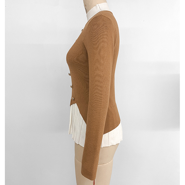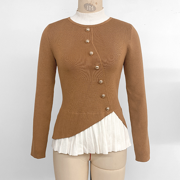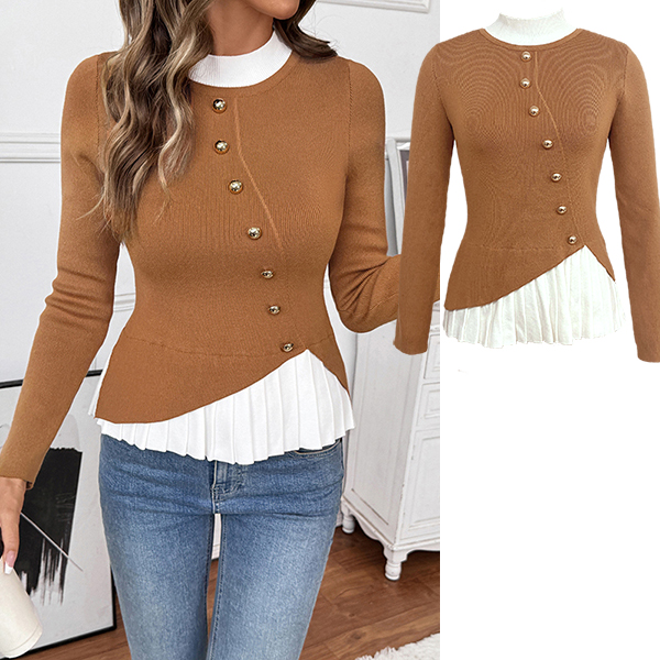 Moderiktig stickad skjorta med rund halsringning och långärmad snedställd knapp, kontrastfärgad veckad fåll