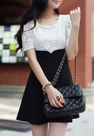 The sweet dress has a short-sleeve lace top with an embellished round neck with metallic panel and a high waisted skirt.Pair it with high heel sandals and clutch bag to achieve a ladylike look.