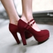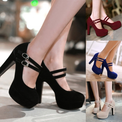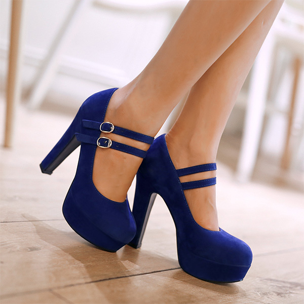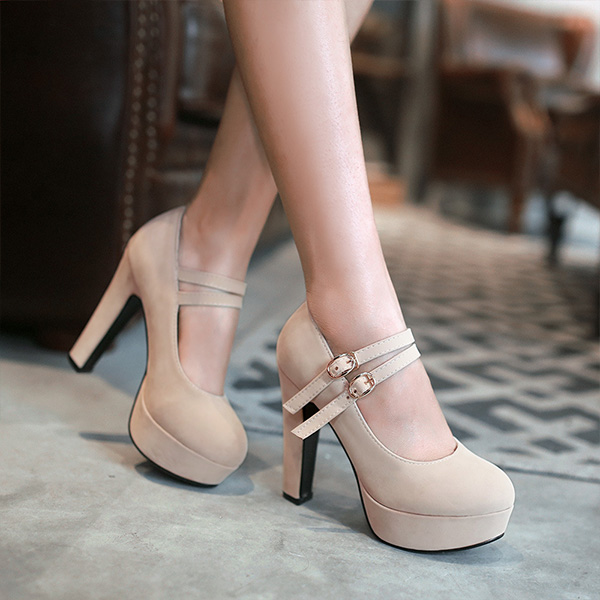 Dessa par har en enfärgad färgsättning, en klassisk rund tå och en ovandel i mocka. Den har 4,72" blockhäl och 0,98" plattform, korsband vamp. Den är lämplig för ditt arbete och lediga dagar.