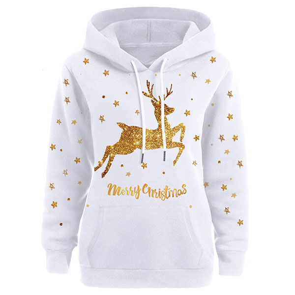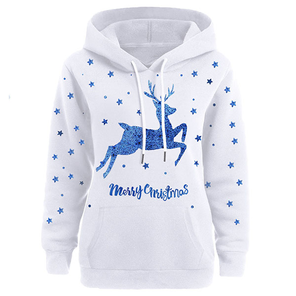 Thanks to the elk printed pattern design,this sweatshirt can lend you a dash of cute and playful vibes to your look. Crafted from soft and breathable fabric,with long sleeve and hooded silhouette,this wonderful piece also can promise you a comfortable day. For the coming Christmas Day,this sweatshirt can be your wise choice.
