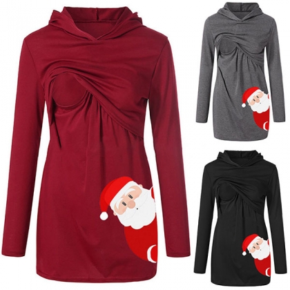 Cute Santa Claus Printed Hooded Multifunctional Breastfeeding Sweatshirt