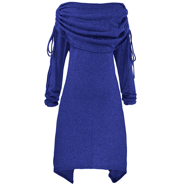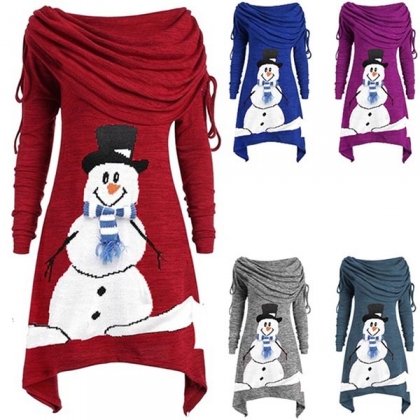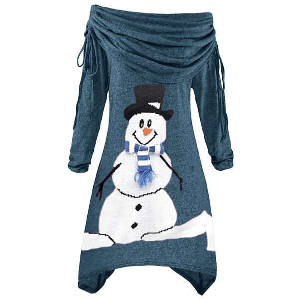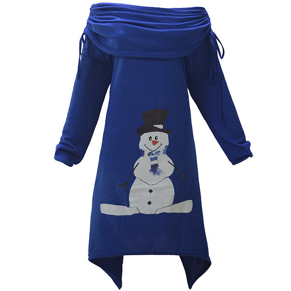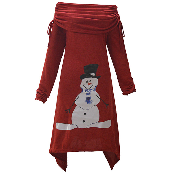 Cute Snowman Printed Long Sleeve Cowl Neck Irregular Hem Dress
