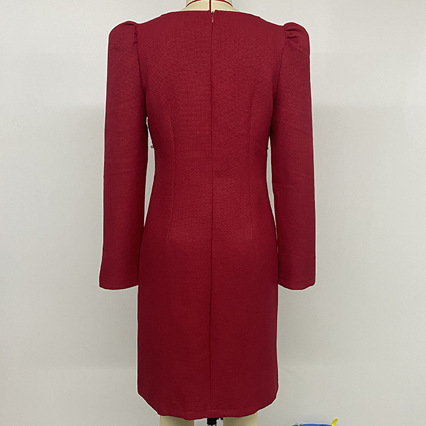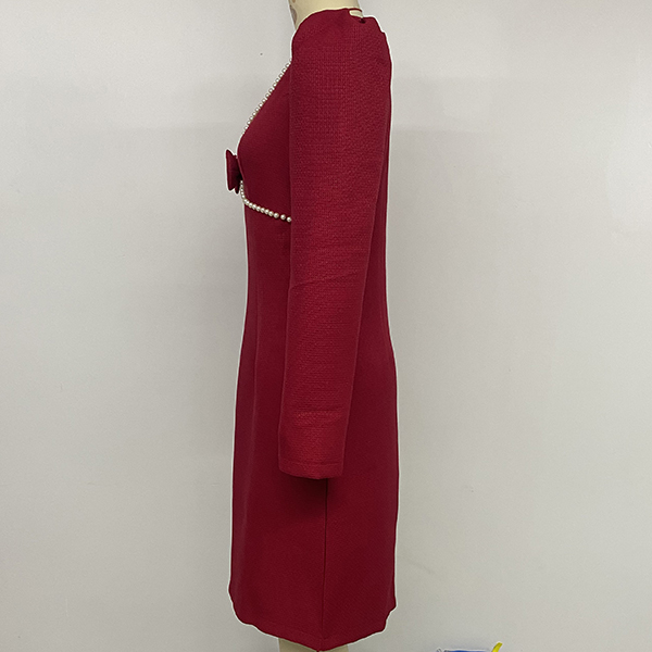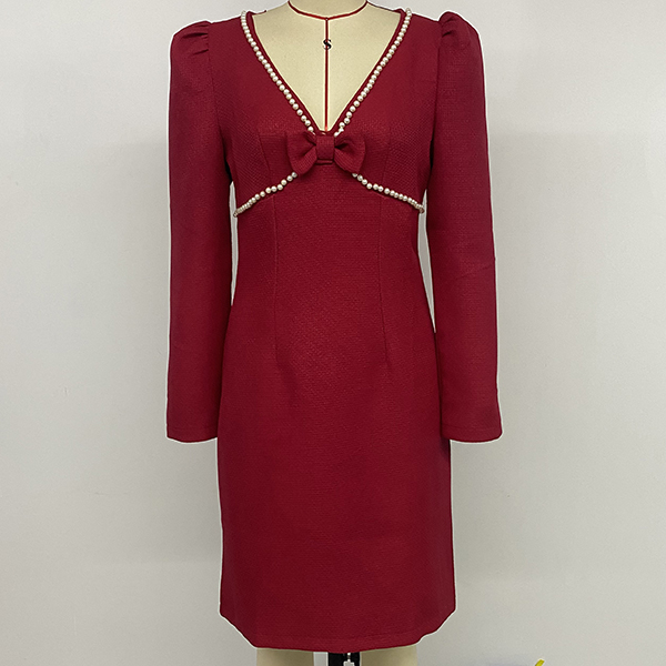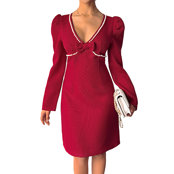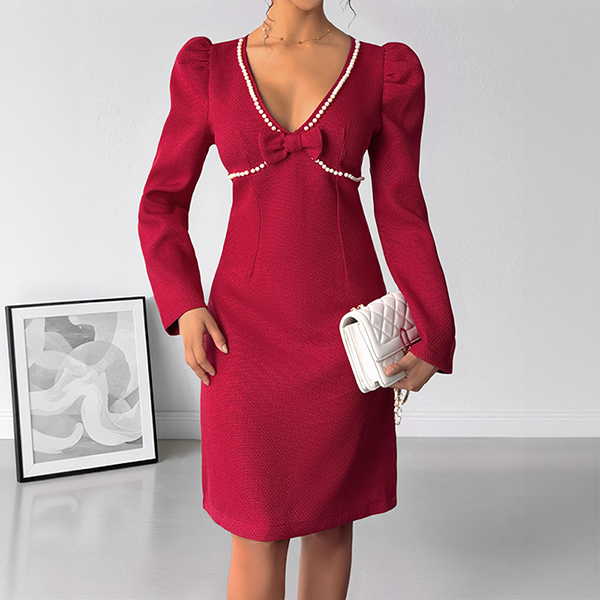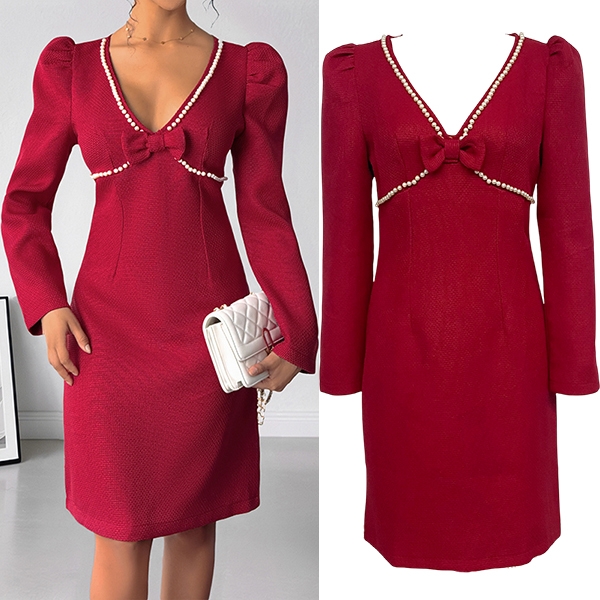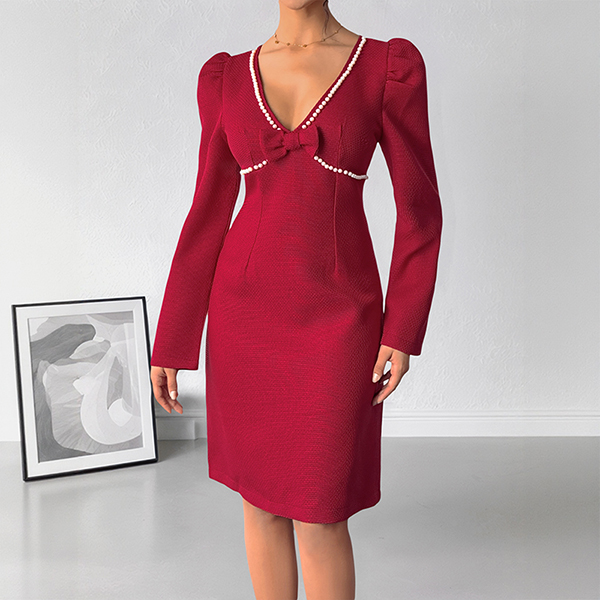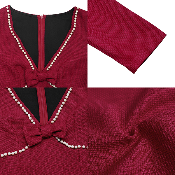 Vintageklänning i rött med djup V-ringning, rosett och pärlprydnader
