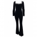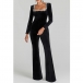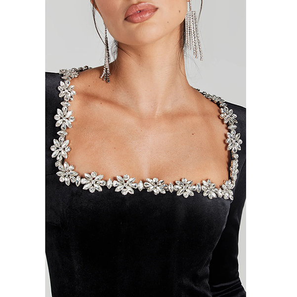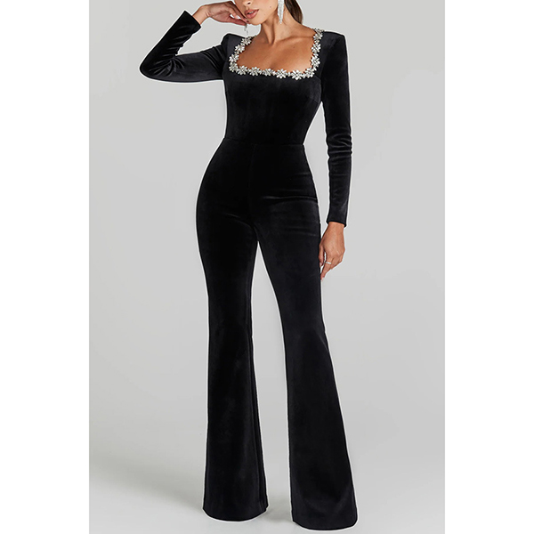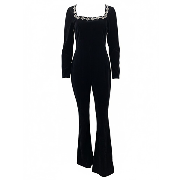 This luxurious jumpsuit features sophisticated square neck styling with exquisite floral rhinestone embellishments and streamlined straight-cut silhouette for contemporary glamorous elegance. Is it your style?