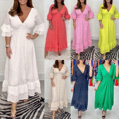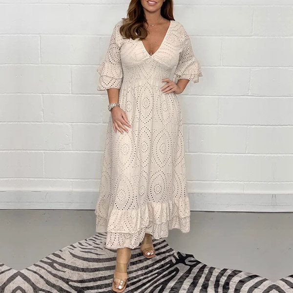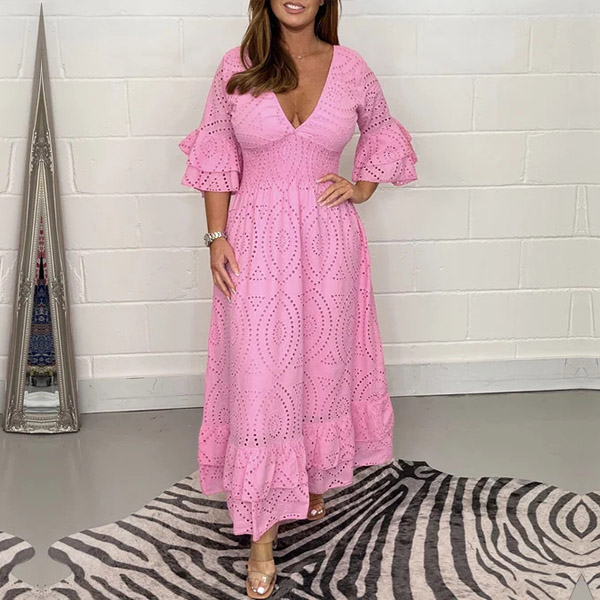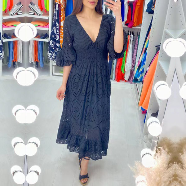 This dress exudes sophistication and femininity, making it perfect for special occasions or formal events. The V-neckline adds a touch of allure, while the elbow-length sleeves provide coverage and a sense of refinement. Whether you’re attending a wedding, a cocktail party, or a gala, this dress is sure to make a statement.