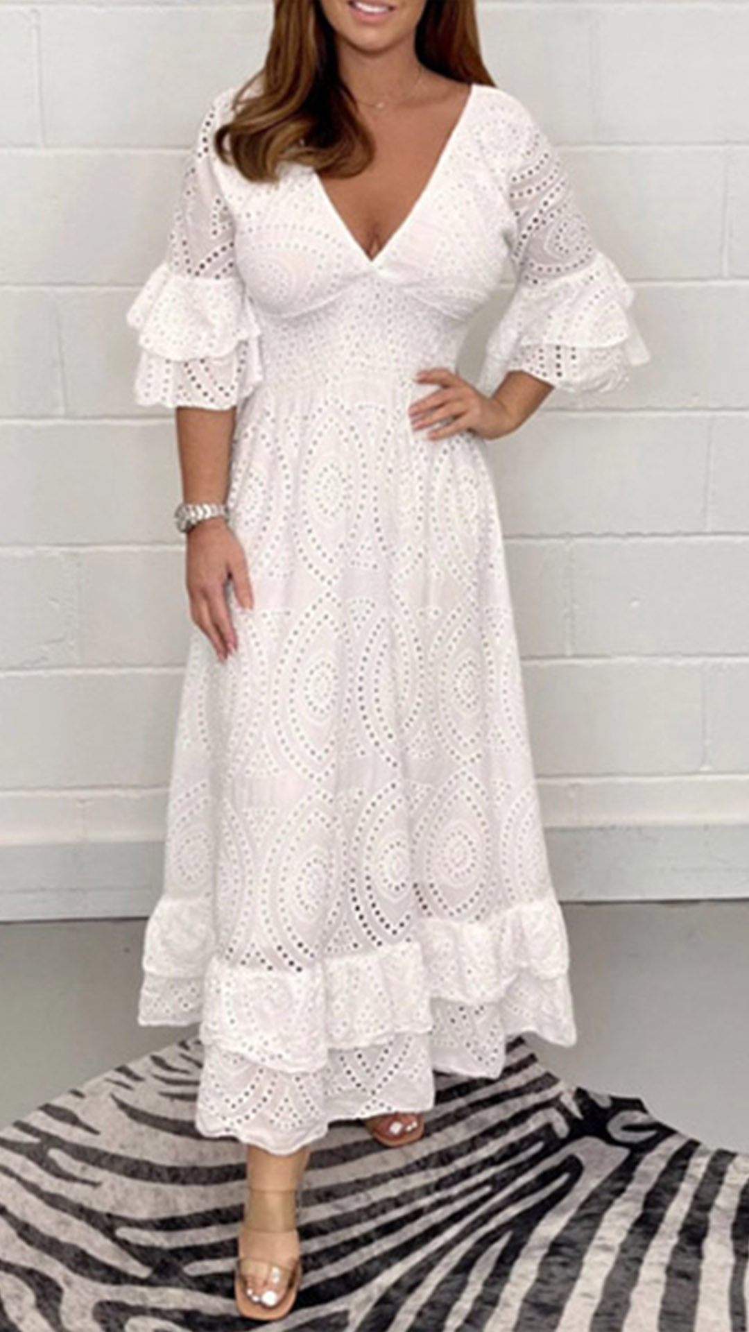 Elegant Lace Spliced V-neck Elbow Sleeve Midi Dress