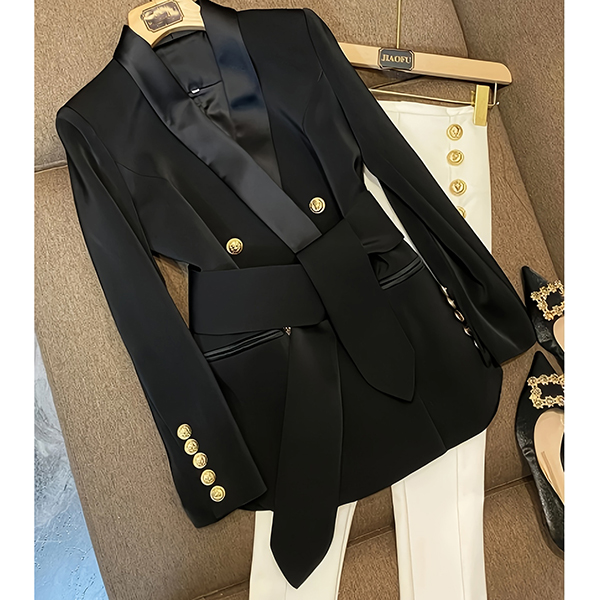 Stilren kavaj med dubbelknäppning och knytband – långärmad design