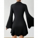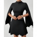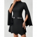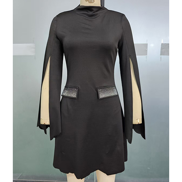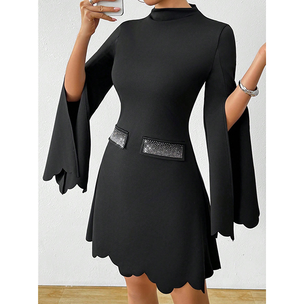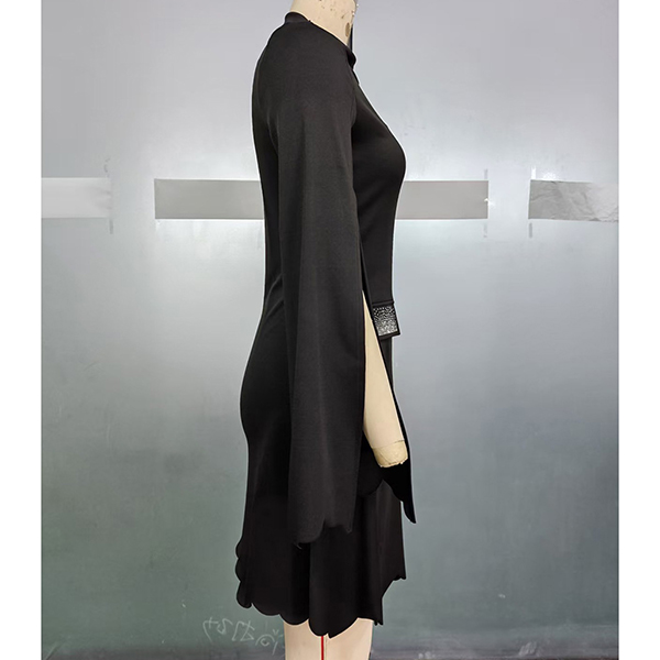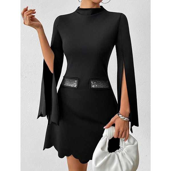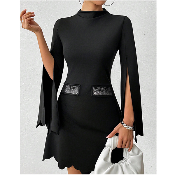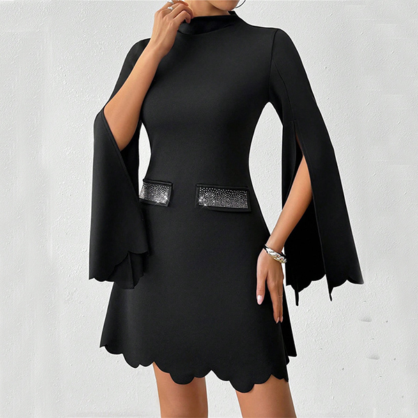 Festklänning elegant svart miniklänning med hög krage, slitsade ärmar och strassdetaljer