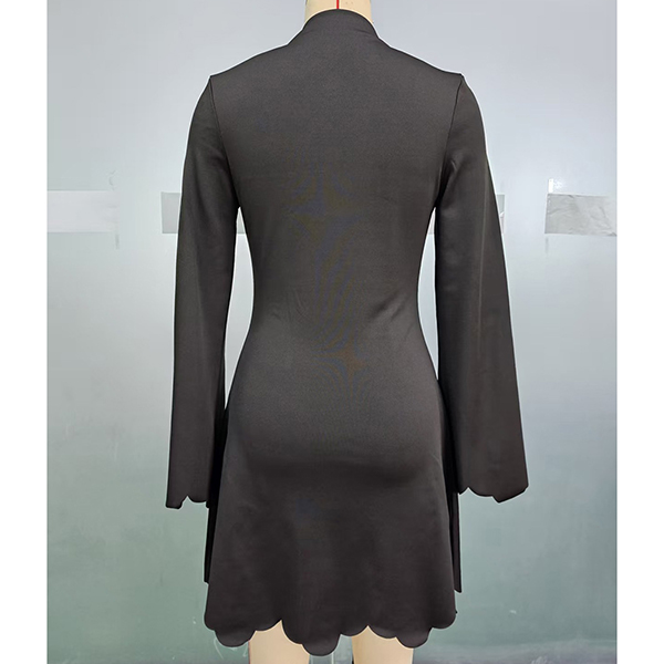 Kliv in i sofistikering med denna fantastiska miniklänning med hög halsringning, designad för den moderna kvinnan som älskar subtil glamour. Detta är inte bara en svart klänning – det är ett iögonfallande plagg som balanserar struktur och ett mjukt flöde.