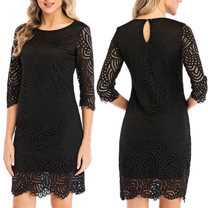 Elegant Solid Color 3/4 Sleeve Round Neck Slim Fit Lace Dress