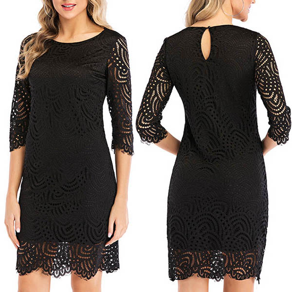 This delicate lace dress would be a secret weapon to portray your elegant and charming image! It is finished with 3/4 sleeve,round neck and a fit silhouette,this dress can give you a perfect transition from daytime gatherings to night events.